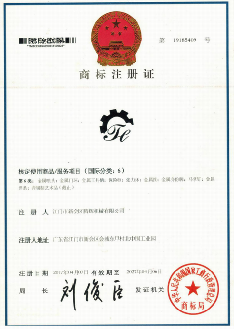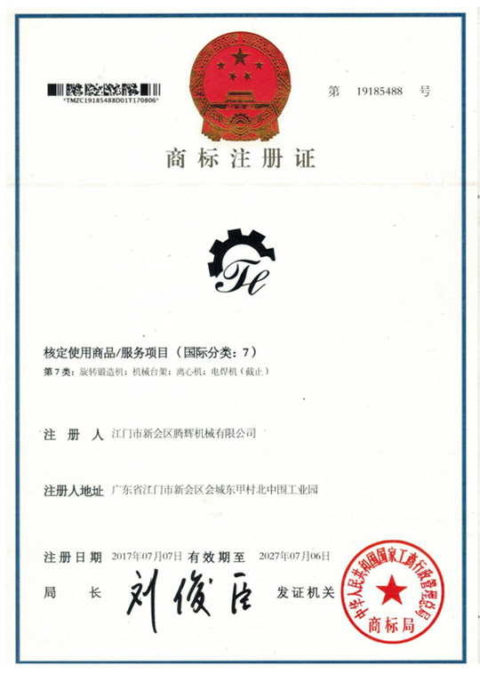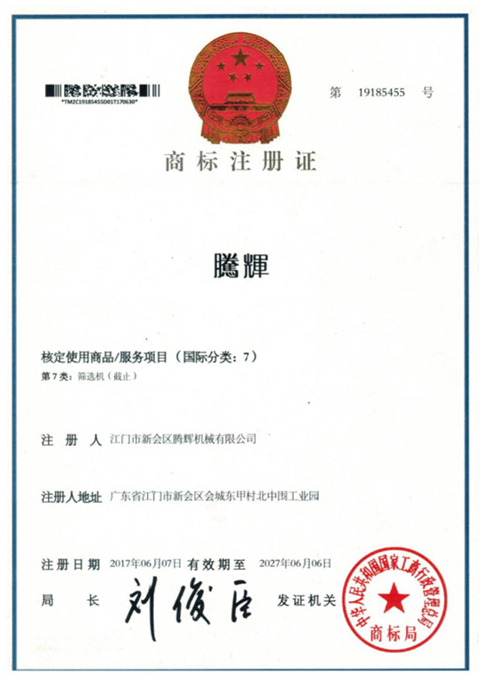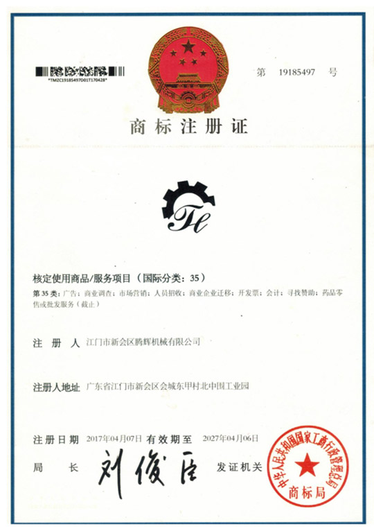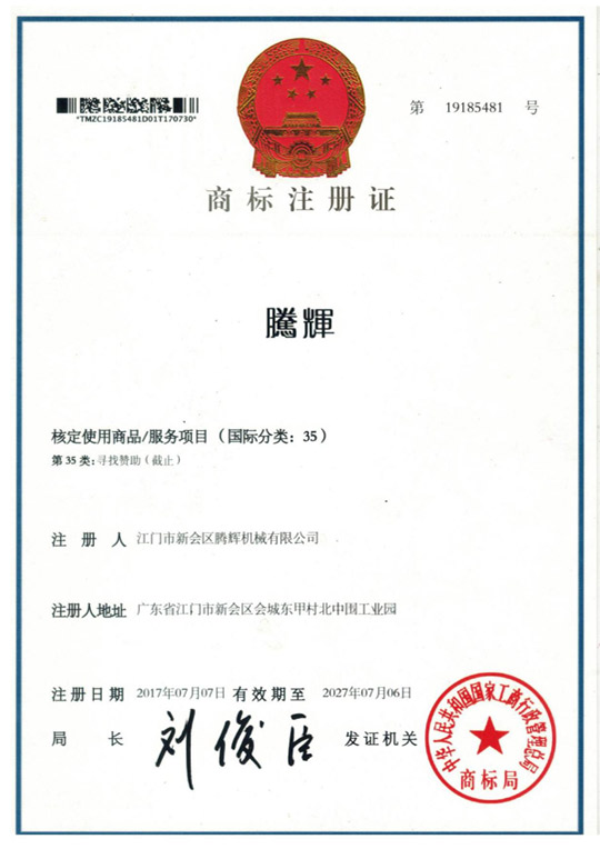 江門市新會區(qū)騰輝機械有限公司獲得國家商標(biāo)局的認(rèn)可圖形商標(biāo)和文字商標(biāo)穩(wěn)固的品牌地位,樹立了良好的企業(yè)形象。