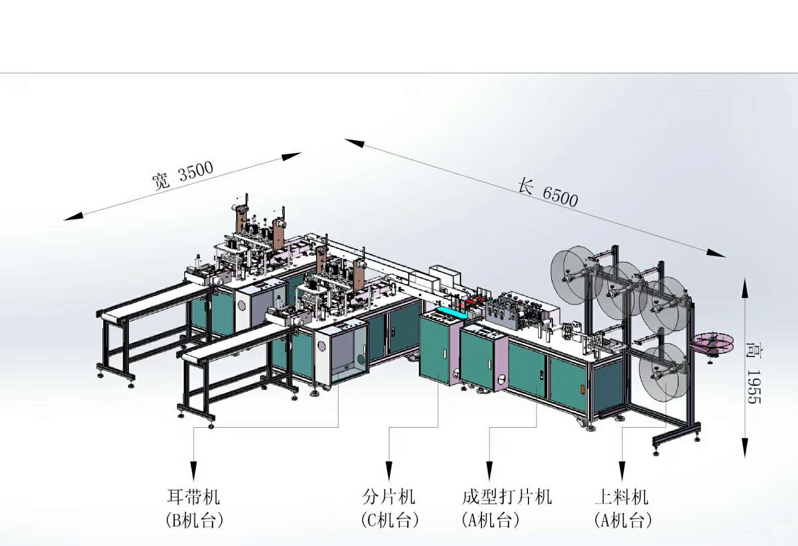 高速全自動一拖二口罩機生產(chǎn)線,是為生產(chǎn)平面口罩而定制的全自動化生產(chǎn)線,從原材料入料到成品完成均為一條線自動化作業(yè),包括自動送料、鼻線插入、折緊、超聲波熔接、切皮、焊線等全程自動化。設(shè)備產(chǎn)量高、操作方便、省工省時,良率高。