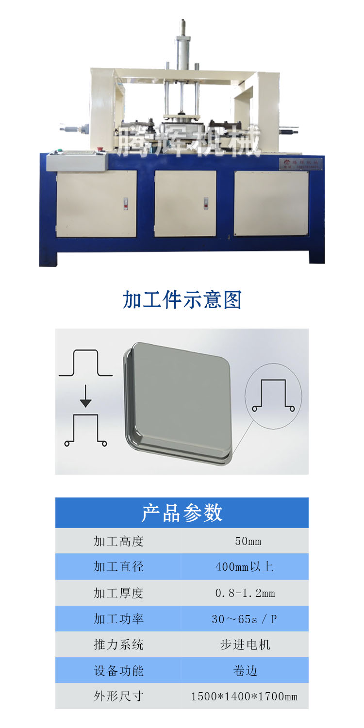 本文介紹的是用于長(zhǎng)方形盤子產(chǎn)品加工設(shè)備異形卷邊機(jī),首先將加工件放在模具上,按一鍵啟動(dòng)后模具旋轉(zhuǎn),卷邊工位進(jìn)刀,跟隨模具旋轉(zhuǎn)施壓加工件的邊緣受壓向內(nèi)卷邊。可任意選擇手動(dòng)/自動(dòng)操作,具有操作方便,性能穩(wěn)定。(公司根據(jù)客戶需求,為客戶量身定制適合的設(shè)備,歡迎新老客戶咨詢了解)